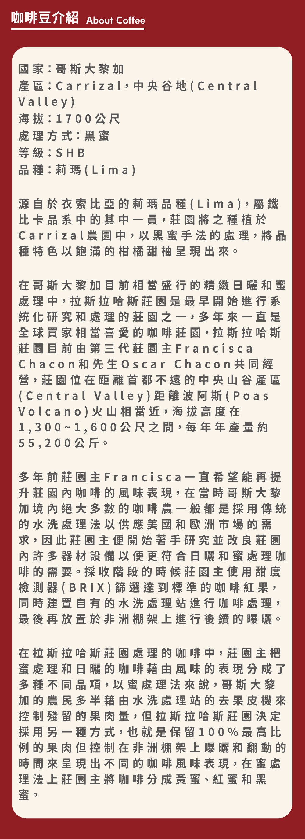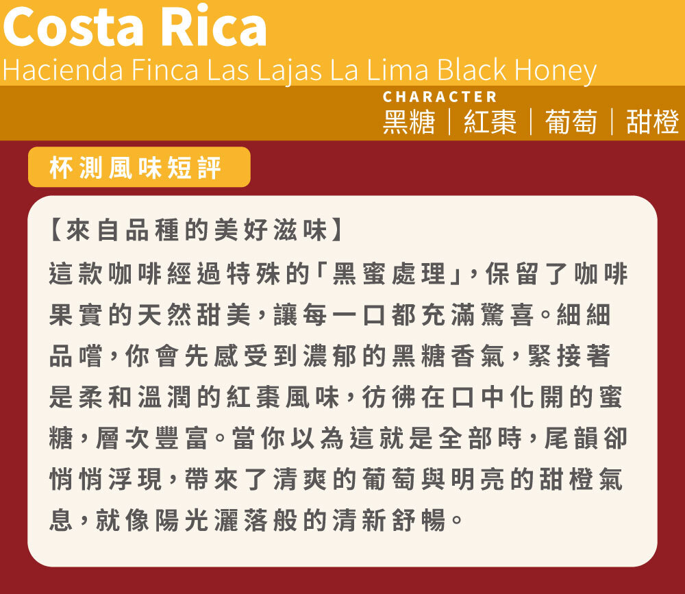 這款咖啡經過特殊的「黑蜜處理」,保留了咖啡果實的天然甜美,讓每一口都充滿驚喜。細細品嚐,你會先感受到濃郁的黑糖香氣,緊接著是柔和溫潤的紅棗風味,彷彿在口中化開的蜜糖,層次豐富。當你以為這就是全部時,尾韻卻悄悄浮現,帶來了清爽的葡萄與明亮的甜橙氣