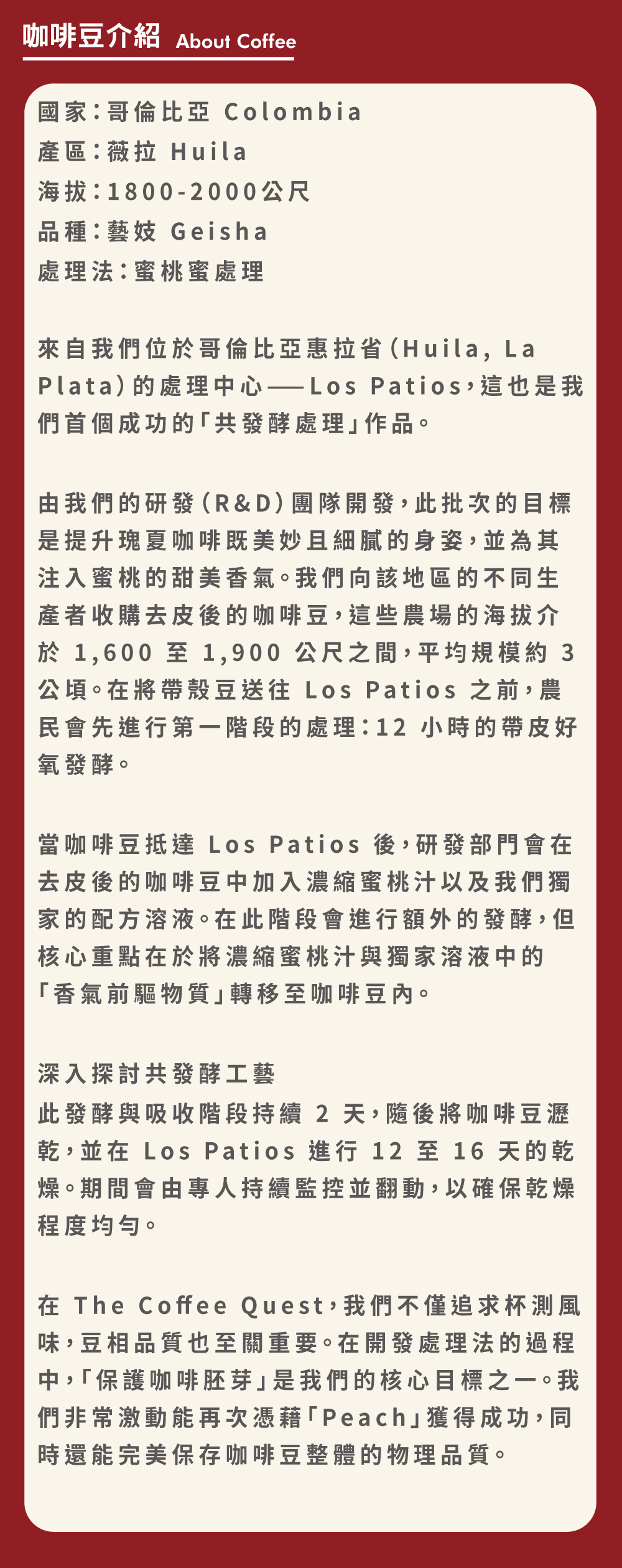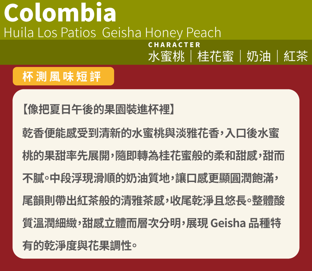 乾香便能感受到清新的水蜜桃與淡雅花香,入口後水蜜桃的果甜率先展開,隨即轉為桂花蜜般的柔和甜感,甜而不膩。中段浮現滑順的奶油質地,讓口感更顯圓潤飽滿,尾韻則帶出紅茶般的清雅茶感,收尾乾淨且悠長。整體酸質溫潤細緻,甜感立體而層次分明