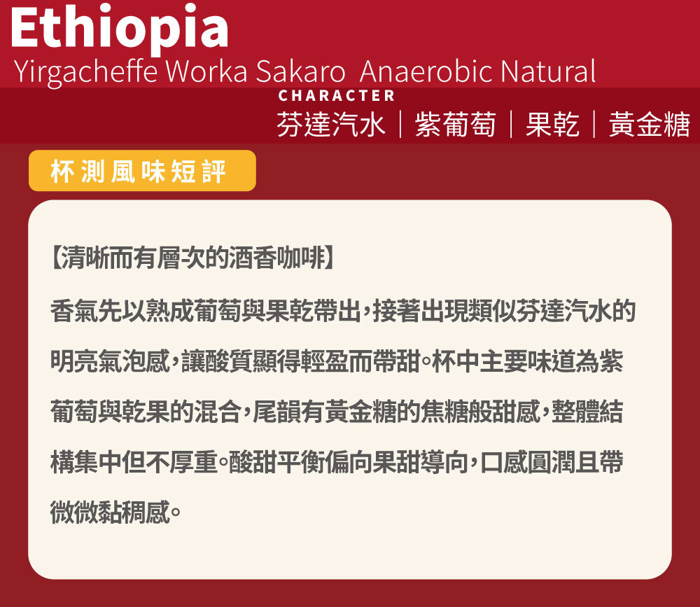 香氣先以熟成葡萄與果乾帶出,接著出現類似芬達汽水的明亮氣泡感,讓酸質顯得輕盈而帶甜。杯中主要味道為紫葡萄與乾果的混合,尾韻有黃金糖的焦糖般甜感,整體結構集中但不厚重。酸甜平衡偏向果甜導向,口感圓潤且帶微微黏稠感。
