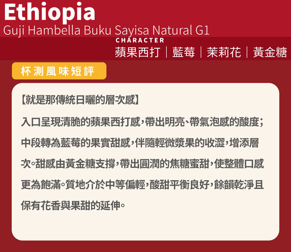 入口呈現清脆的蘋果西打感,帶出明亮、帶氣泡感的酸度;中段轉為藍莓的果實甜感,伴隨輕微漿果的收澀,增添層次。甜感由黃金糖支撐,帶出圓潤的焦糖蜜甜,使整體口感更為飽滿。質地介於中等偏輕,酸甜平衡良好,餘韻乾淨且保有花香與果甜的延伸。