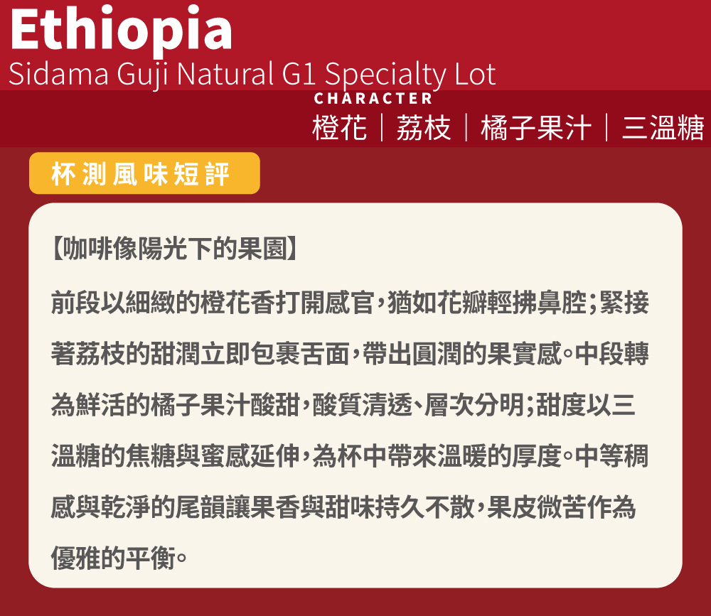 前段以細緻的橙花香打開感官,猶如花瓣輕拂鼻腔;緊接著荔枝的甜潤立即包裹舌面,帶出圓潤的果實感。中段轉為鮮活的橘子果汁酸甜,酸質清透、層次分明;甜度以三溫糖的焦糖與蜜感延伸,為杯中帶來溫暖的厚度。中等稠感與乾淨的尾韻讓果香與甜味持久不散