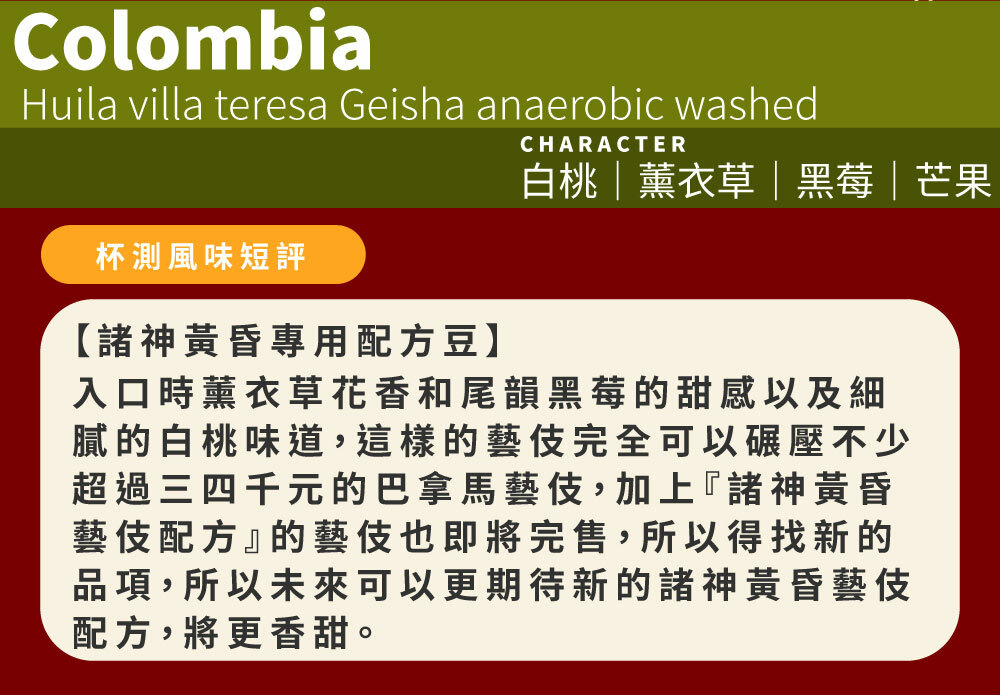 入口時薰衣草花香和尾韻黑莓的甜感以及細膩的白桃味道,這樣的藝伎完全可以碾壓不少超過三四千元的巴拿馬藝伎,加上『諸神黃昏藝伎配方』的藝伎也即將完售,所以得找新的品項,所以未來可以更期待新的諸神黃昏藝伎配方,將更香甜。