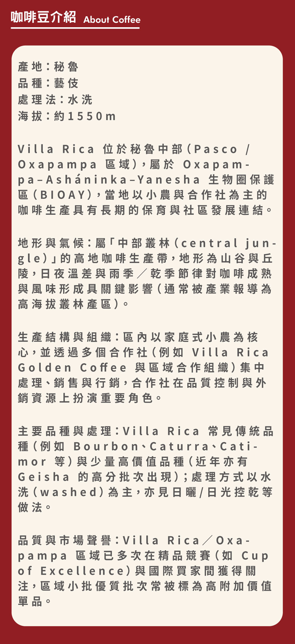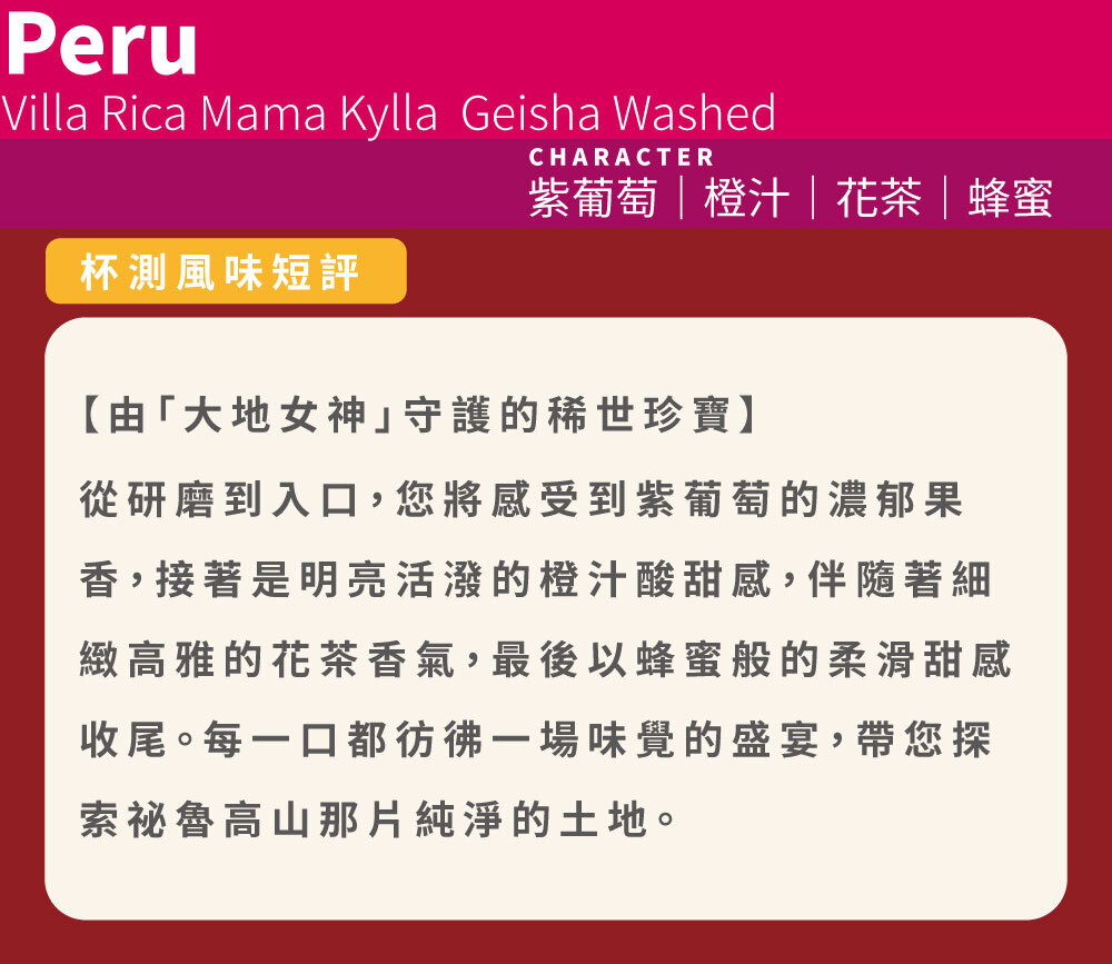從研磨到入口,您將感受到紫葡萄的濃郁果香,接著是明亮活潑的橙汁酸甜感,伴隨著細緻高雅的花茶香氣,最後以蜂蜜般的柔滑甜感收尾。每一口都彷彿一場味覺的盛宴,帶您探索祕魯高山那片純淨的土地。