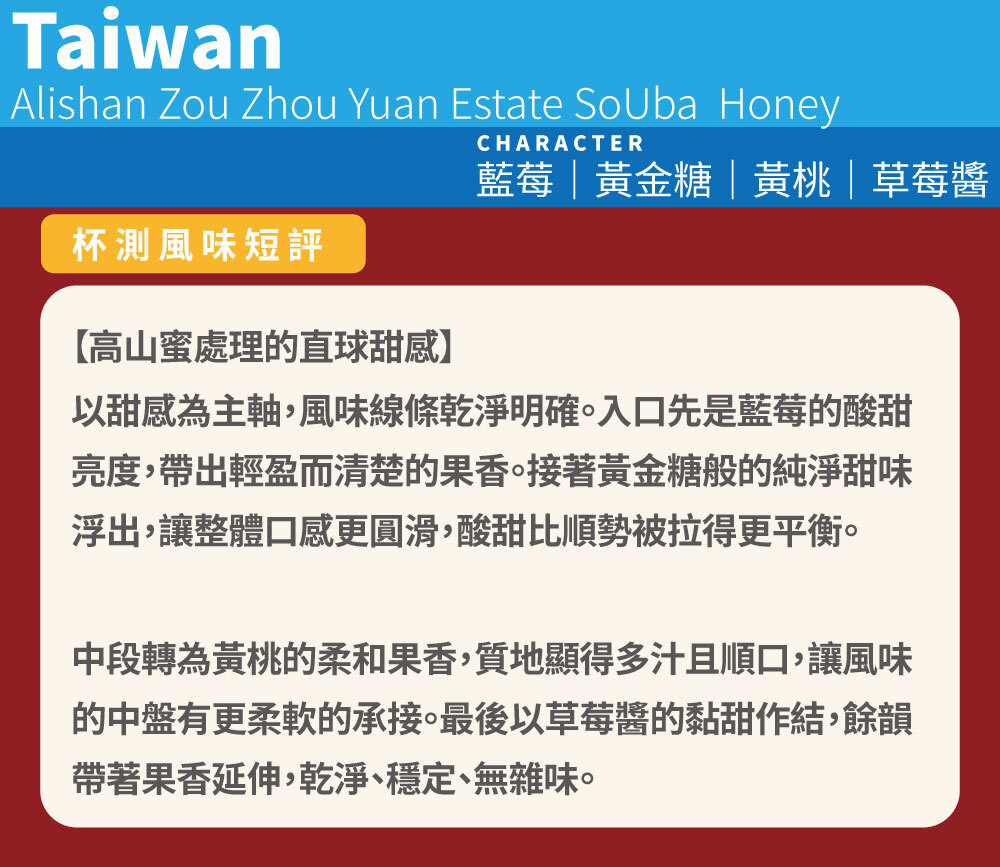以甜感為主軸,風味線條乾淨明確。入口先是藍莓的酸甜亮度,帶出輕盈而清楚的果香。接著黃金糖般的純淨甜味浮出,讓整體口感更圓滑,酸甜比順勢被拉得更平衡。